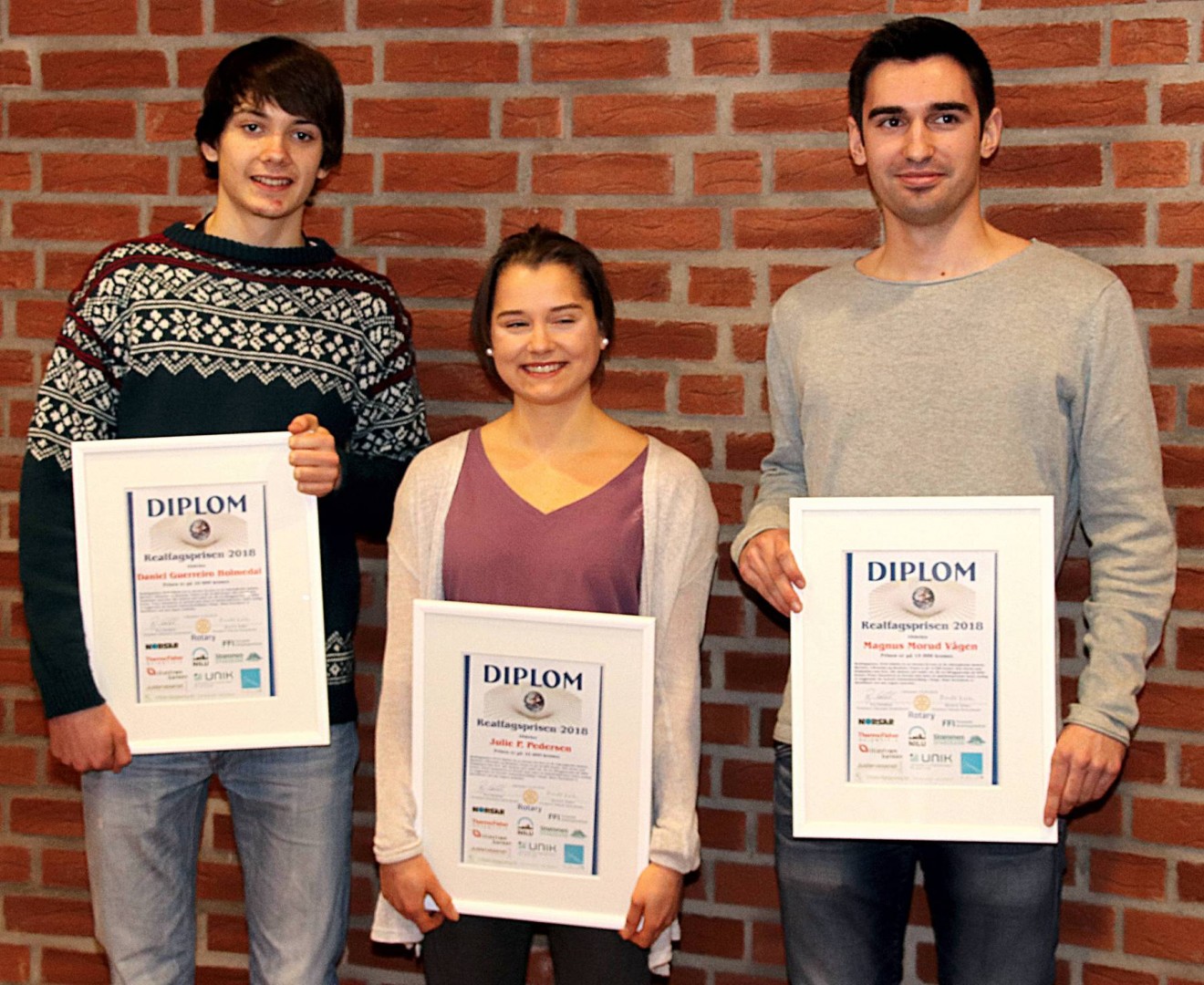 Vinnerne av Relfagsprisen 2018: Fra venstre. Daniel Guerreiro Holmedal, Julie P. Pedersen og Magnus Morud Vågen (bestemannsprisen).